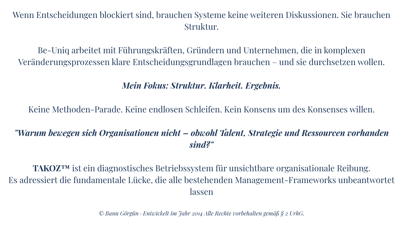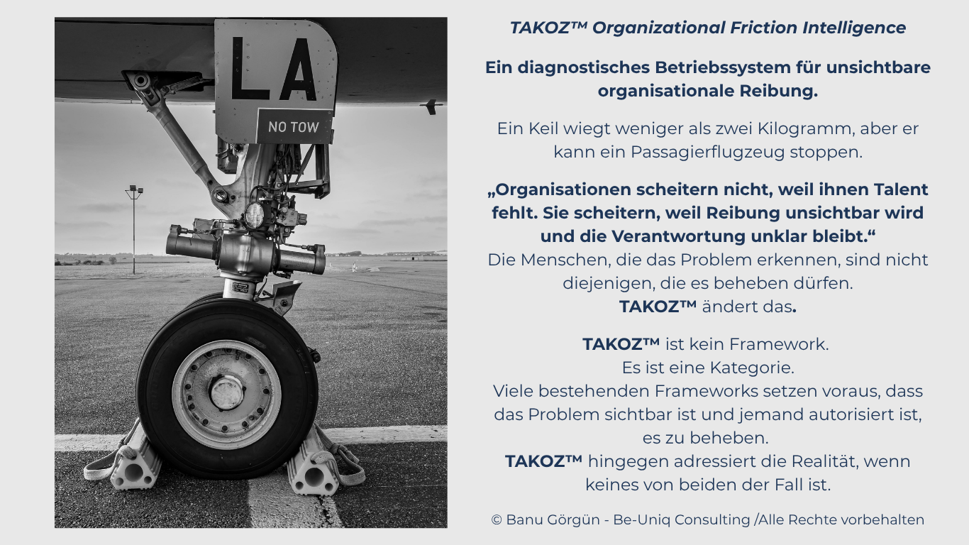 TAKOZ™ Organizational Friction Intelligence T — TRACE A — ANALYZE K — KEY LEVER O — OPERATE Z — ZERO IN - Entscheidungsarchitektin & Sparringpartnerin - © Banu Görgün